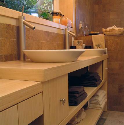 竹浴室柜以楠竹為基材,巧妙運用竹材優良的物理性質,結合國內外精湛工藝,凸顯出設計的創造性和生活的品質。竹子具有優良的物理特性,有很強的硬度(硬度優于橡木)和韌性,而且穩定性好,使用壽命高出木質衛浴家具很多,因此比其它木質產品更適合在衛浴間使用。